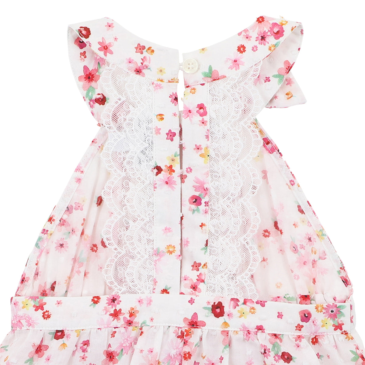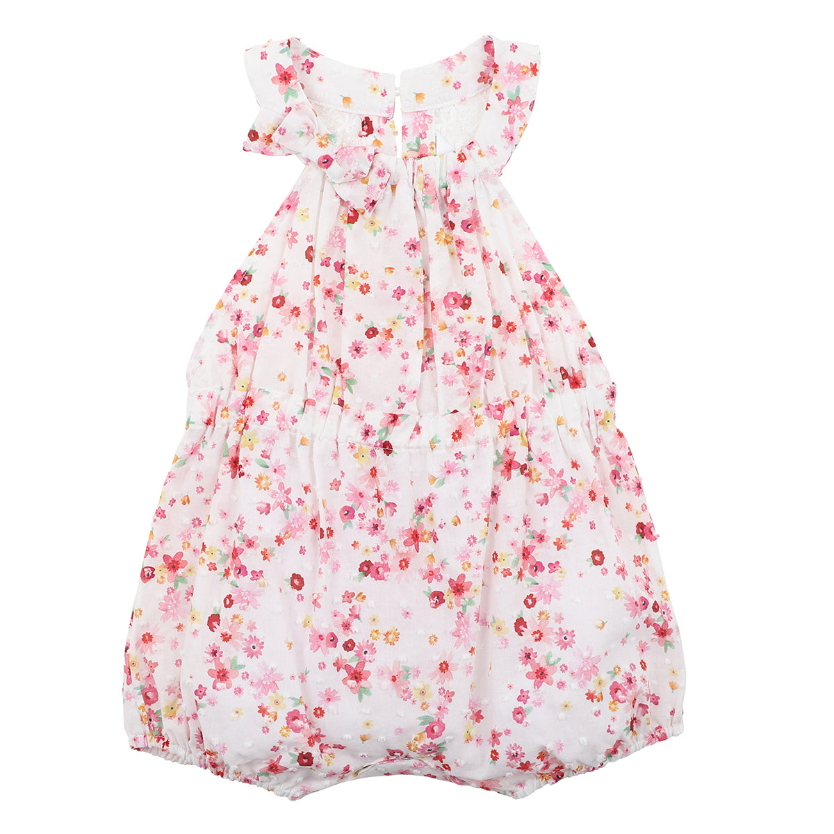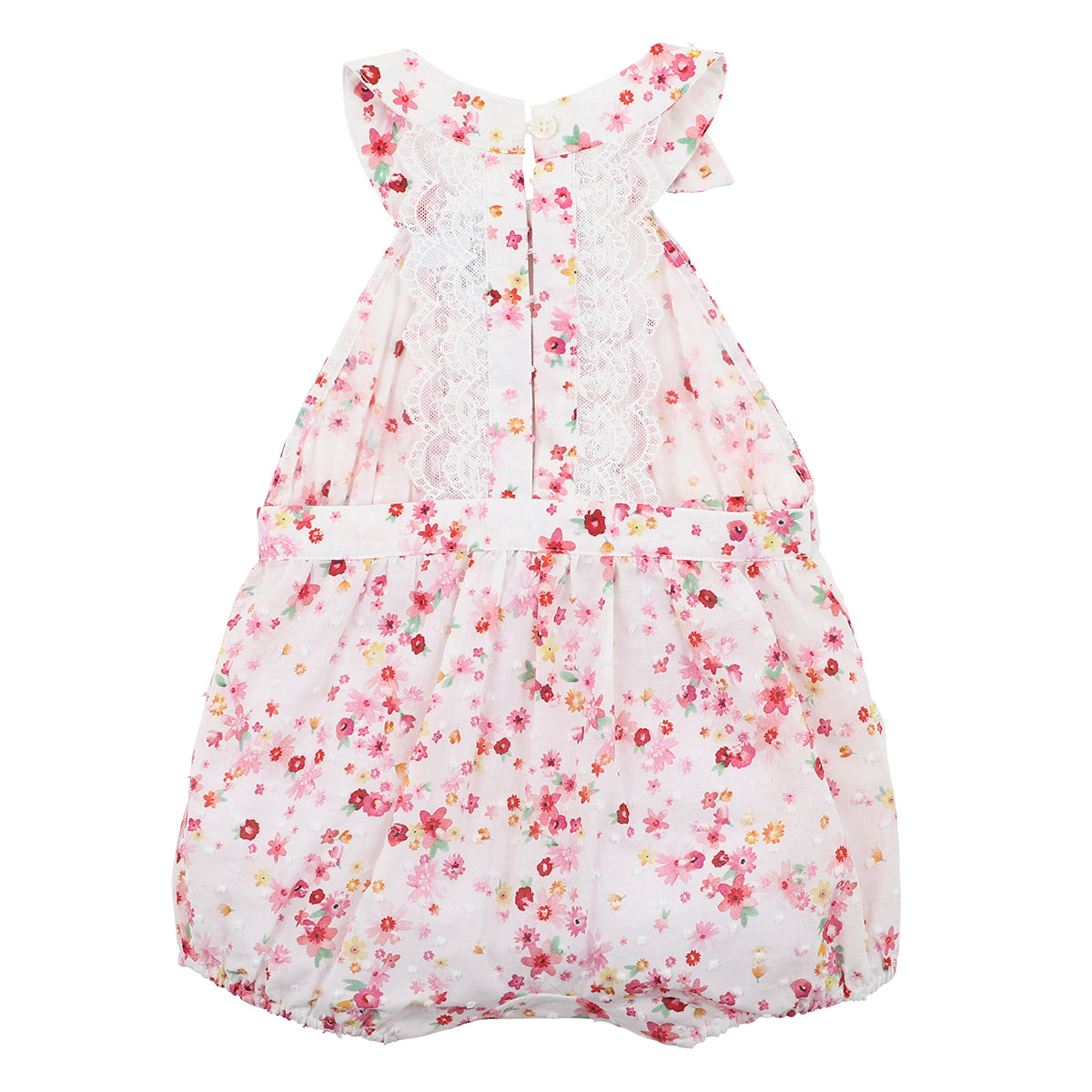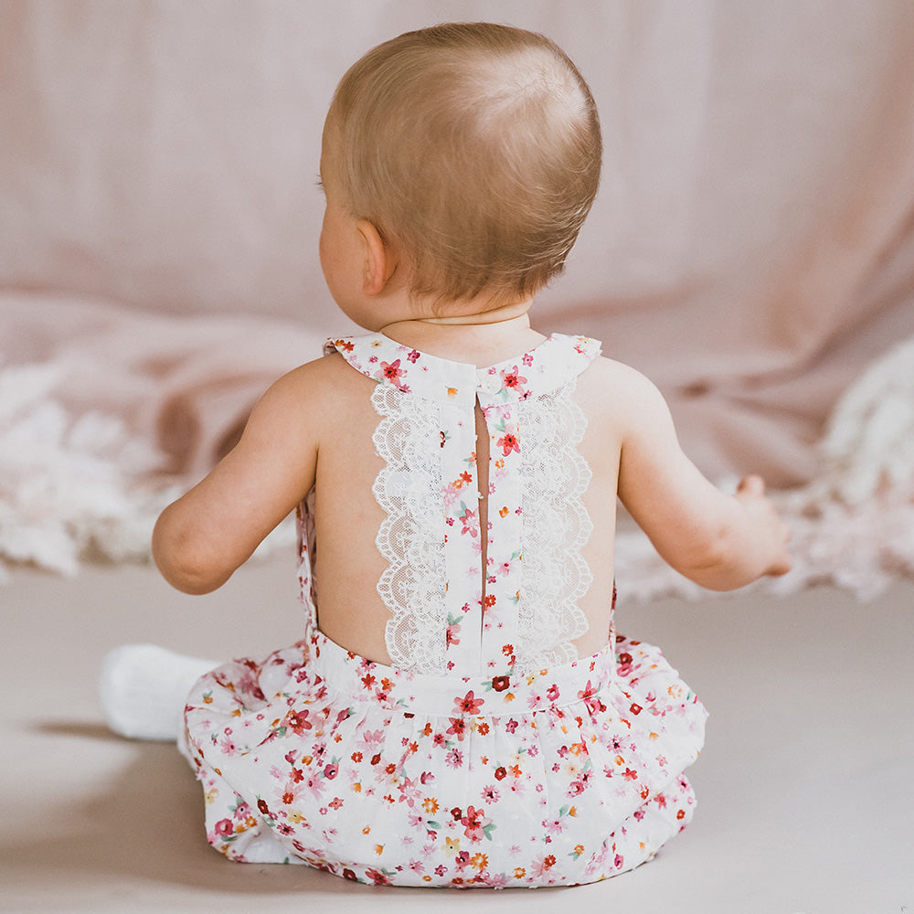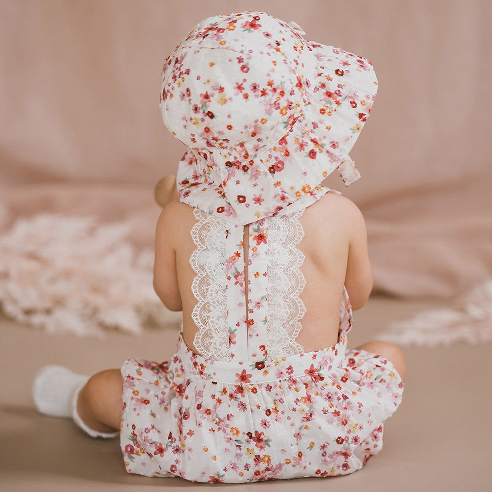 The Hazel Lace Back Playsuit from Bebe is a pretty cotton dobby floral print playsuit featuring a lace back bodice with front bow, elastic waist and leg cuffs, back neck button opening and a concealed press stud crotch opening for ease of dressing. This is the prettiest little baby girls summer outfit. Pair with the Hazel Print Sun Hat for the perfect baby girls summer outfit.