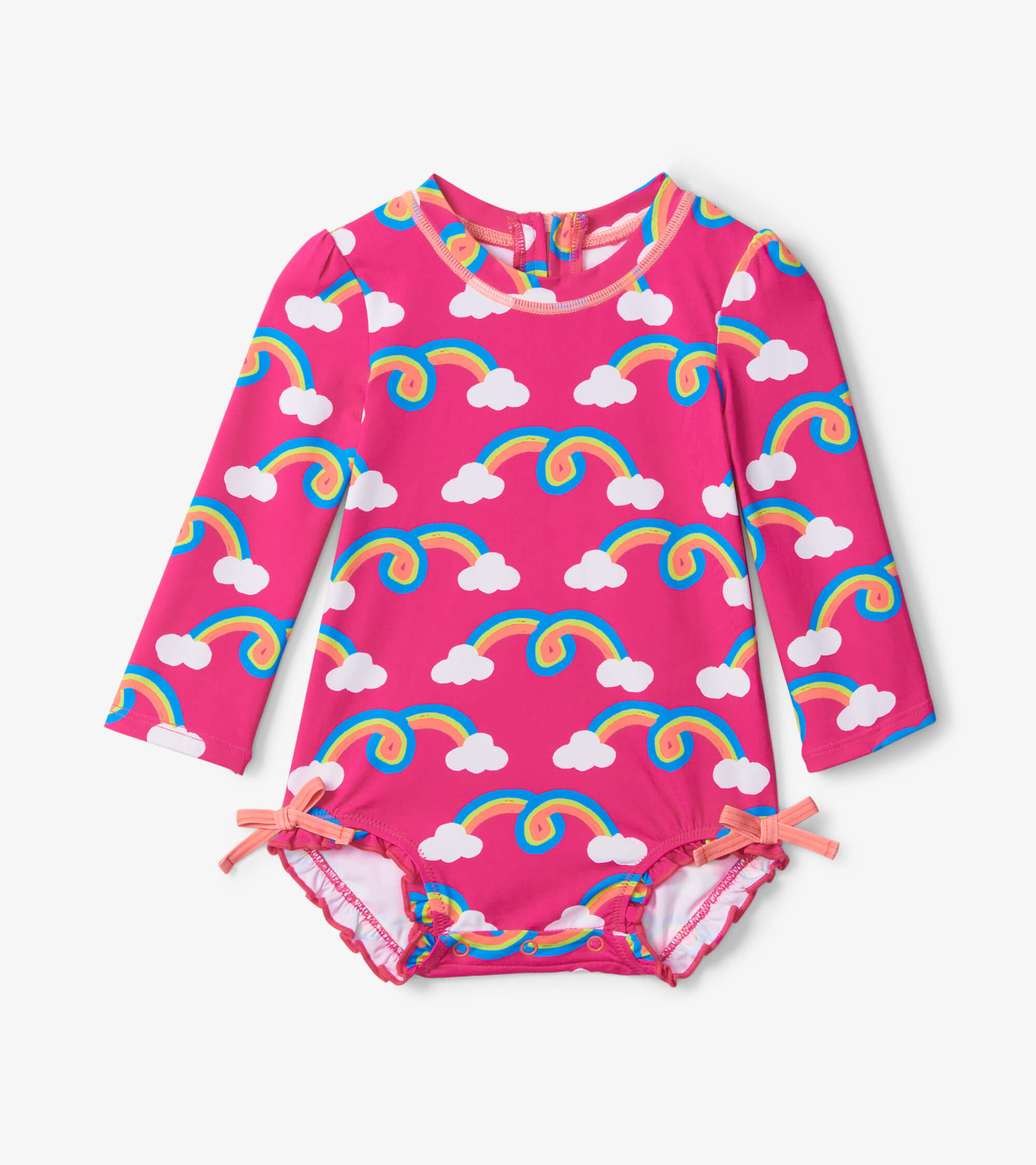 The Rainbow Arch Baby Rashie from Hatley is the cutest baby girl swimsuit. With its endearing print and adorable ruffled leg openings, this long sleeve rashie is the perfect choice for days at the beach! Featuring a UPF 50+ sun protection, a zipper closure on the back and a snap closure at the inseam (hello, easy diaper changes), it’s no wonder this rashie is beloved by so many mums.